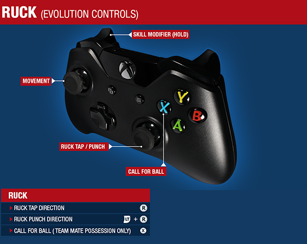 * Rucks – Ruck contests are similar to marking contests but you cannot mark the ball. While the ball is in the air, use the right stick to tap the ball to your teammates. Hold when using the right stick to perform a powerful but less accurate punch. Winning ruck contests depends on your position and timing as well as the strength and height of your ruckman.
