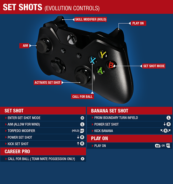 * Set Shots – When you take a mark or are awarded a free kick near the goals, you can elect to take a set shot by pressing . While in the set shot mode, your kicks are affected by wind speed and direction. Adjust your aim by panning the camera with the left stick, then hold the right stick back to charge your kick and flick it forward to release. Flicking the right stick to the left or right will add additional curve to the ball.