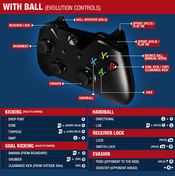 * Fend and Evade – Tap the right stick left or right just before getting tackled to side step your opponent. Pushing up on the right stick will perform a fend action against your opposition. To increase your chances of success, attempt these actions the moment before you get tackled. Make sure you have enough stamina or you will get tackled.