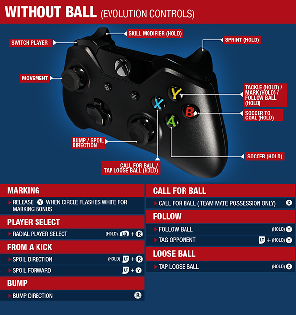 * Spoiling – Hold and tap to spoil the ball. Hold and use the right stick to spoil the ball in a desired direction. Spoiling the ball is easier to do than marking the ball. Successful spoils are also dependent on positioning and timing.
