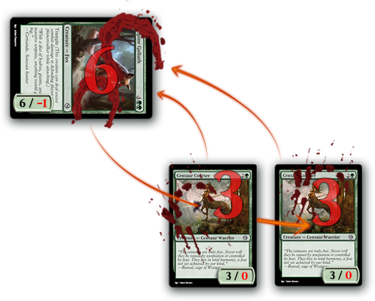 Une créature qui a la double initiative inflige des blessures deux fois au combat : une première quand les créatures infligent des blessures d'initiative, et une seconde quand les créatures infligent des blessures normales. Il est possible pour une créature avec la double initiative d'infliger des blessures à une autre créature et de la détruire avant que celle-ci ne puisse infliger ses blessures de combat.
