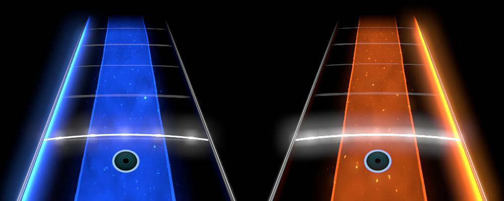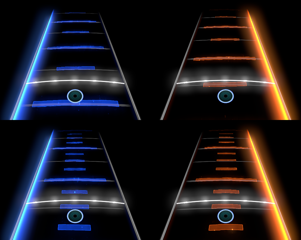 Sometimes smaller-looking notes will appear on the track—these are Hammer-On/Pull-Off Notes. If you've successfully played a note before one of these, you can play a "HOPO" note by pressing the proper fret WITHOUT strumming.