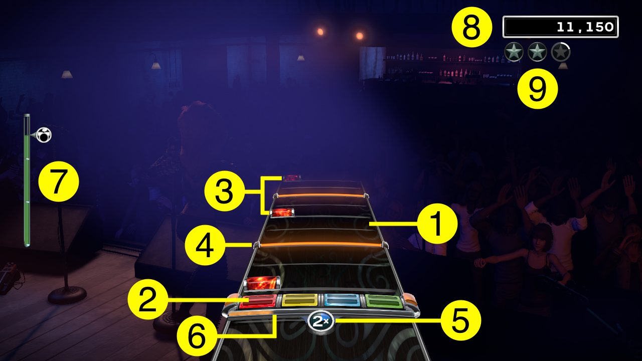 Keep an eye on the crowd meter—it tells you how much the audience is digging your performance. Miss too many notes and the crowd meter will slip into the red. When it's completely empty, you get kicked off the stage.